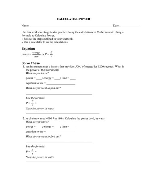 Worksheets are power work, energy calculation work 2018, ohms law and power equation practice work, electrical. P = w / t. This worksheet is for power calculations at gcse.